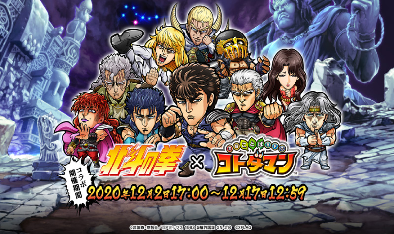 『北斗の拳』と株式会社ミクシィのエンターテインメント事業ブランド「XFLAG (エックスフラッグ)」は、スマホアプリ「共闘ことばRPG コトダマン」(以下、コトダマン)において、コラボイベントを2020年12月2日(水)より開催します。