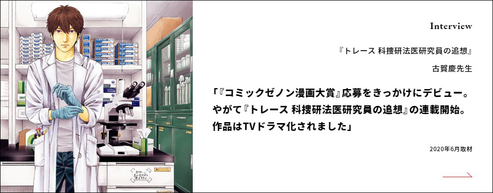 コアミックスが開催する「コミックゼノン漫画⼤賞」入賞をきっかけに漫画家としてデビューし、『トレース 科捜研法医研究員の追想』を月刊コミックゼノンに連載中の古賀慶先生にお話をうかがいました。