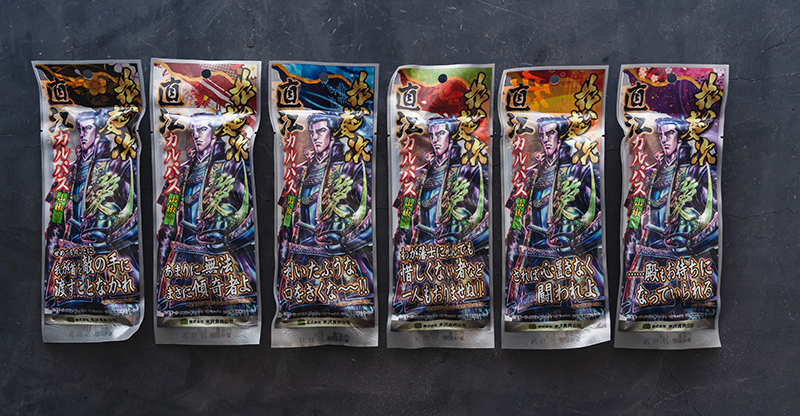 「直江カルパス」は、ピリっとした漢の山椒入りで、直江の名ゼリフが全6種類。さらに、直江カルパスのJANコードは末尾が111(愛・愛・愛)となっています。