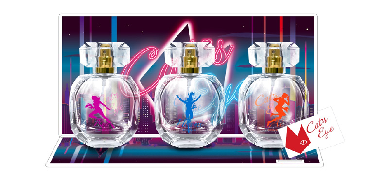 3姉妹のセクシーなシルエット入りのボトル3種をアクリルスタンドに並べると、夜の都会を駆け回る怪盗「キャッツ♥アイ」が登場‼飾って楽しめる豪華香水スタンドです。