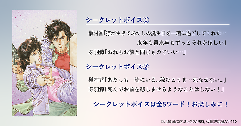 コラボレーションモデルのデザインは2種類。冴羽獠(CV.神谷明さん)と槇村香(CV.伊倉一恵さん)による録り下ろしシステム音声が搭載されています。本モデルでしか聴くことができない「シークレットボイス」もお楽しみいただけます。獠と香の2人の掛け合いをお楽しみください。