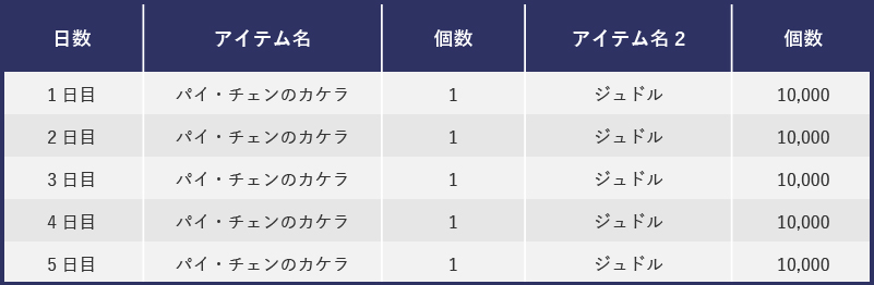 8月5日(水)からは、UR「パイ・チェン」の参戦を記念した特別なログインボーナスが登場!期間中に5日間ログインすると、合計で「パイ・チェンのカケラ」5個と50,000ジュドルが手に入ります。