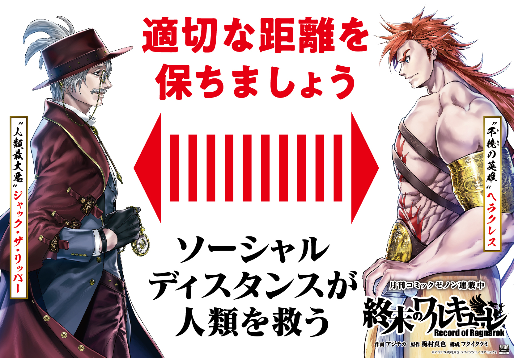 コロナウイルス感染症予防を目的に、コアミックスでは『終末のワルキューレ』の人気キャラクターを用いたソーシャルディスタンス啓発ポスターを作成。書店様向けに配布し、読者の方々への呼びかけを開始いたしました。