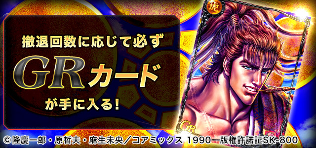 『花の慶次』の主人公「前田慶次」が敵として現れ、チーム全員で2日間のうちに「前田慶次」を倒した合計回数に応じて「GR前田慶次」を入手できます。「前田慶次」を50回倒すと最大21枚の「GR前田慶次」を入手でき、21枚集めることでカードを限界突破MAXに進化させることができます。