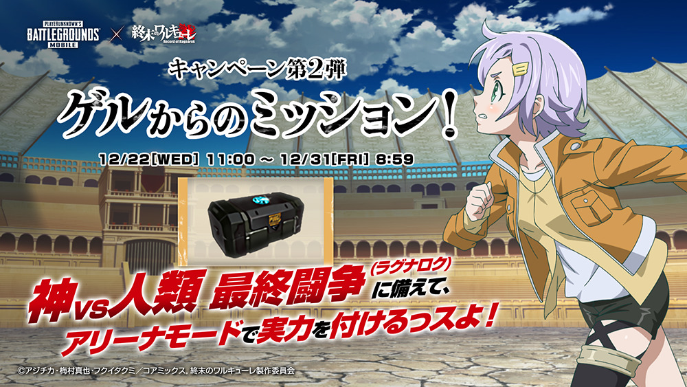 緊急事態です!ゲルから神VS人類最終闘争(ラグナロク)に備えるべく、ミッションが届きました。12月22日(水) 11:00から12月31日(金) 8:59までのイベント期間中に、アリーナモードをプレイして鍛錬することで、コラボアイテムが入っているイベントクレートを最大20個貰えます!是非、この機会にアリーナモードに挑戦してみてください!