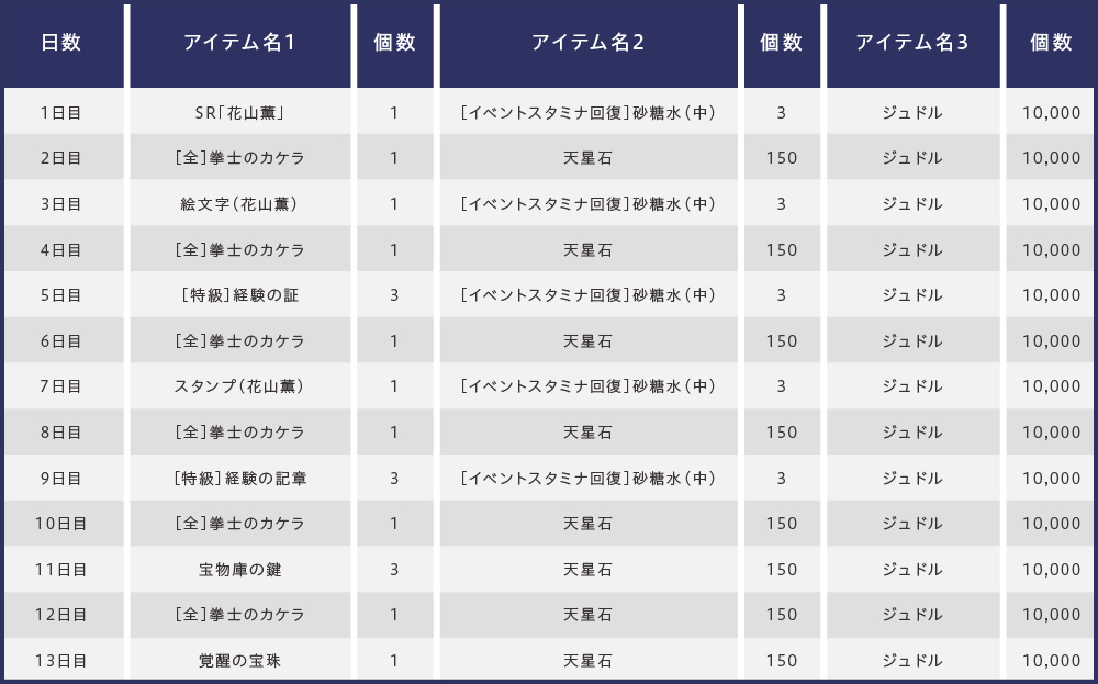 アニメ『バキ』コラボ開催を記念して、豪華報酬が獲得できるログインボーナスを実施します。期間中13日間ログインで、SR「花山薫」や、「天星石」1,200個や1,300,000ジュドルなどをもれなくプレゼントします。