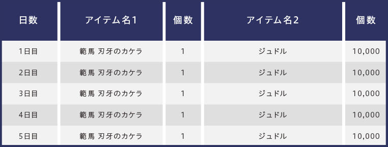 アニメ『バキ』より、新拳士のUR「範馬 勇次郎」参戦を記念した特別なログインボーナスです。期間中に5日間ログインすると、合計で「範馬 勇次郎のカケラ」5個と50,000ジュドルが手に入ります。