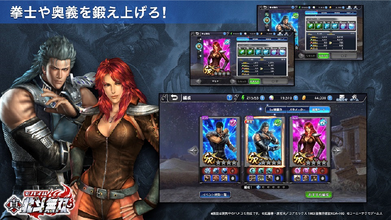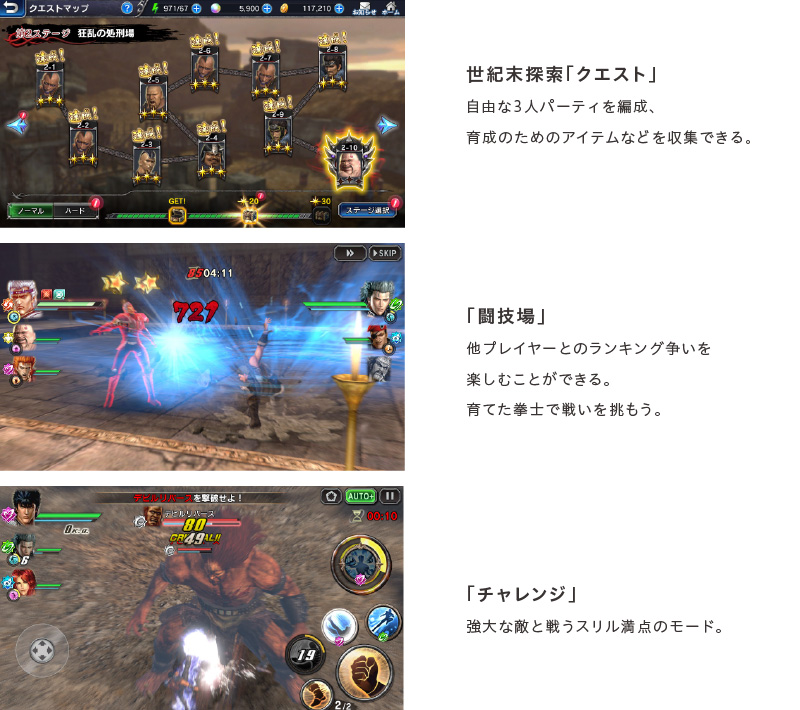 メインストーリーのほかにも、原作ではありえない編成で世紀末を探索する「クエスト」、他プレイヤーとの協力「ギルド」や他のプレイヤーとのランキング争いが楽しめる「闘技場」、