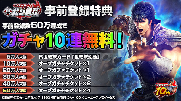 現在実施中の事前登録の件数に応じて、ガチャチケットや戦闘を優位に進めるアイテム(世紀末カード)など、スタートダッシュができるアイテムをプレゼントいたします。