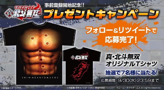 ○概要:『真・北斗無双』配信決定&事前登録開始を記念して、公式Twitter(https://twitter.com/kt_hokuto)にて「北斗無双」オリジナルTシャツが抽選で7名様に当たるキャンペーン開催。