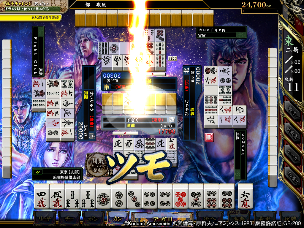 ケンシロウ伝、ラオウ伝の(四人打ち・三人打ち)いずれかを選択し、立ちはだかる7人の強敵を倒すイベント!対局であがって闘気を増やし、強敵を打ち倒せ!