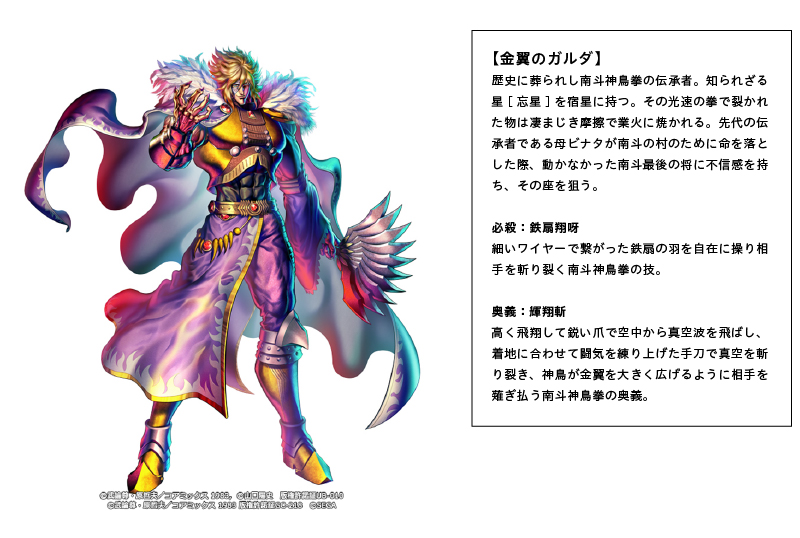 200万ダウンロードを突破したスマートフォン向けゲームアプリ『北斗の拳 LEGENDS ReVIVE (以下、「北斗リバイブ」)』にて、『北斗の拳』のスピンオフ作品『金翼のガルダ 北斗の拳外伝〜南斗五車星前史〜』との外伝イベントとして、南斗神鳥拳伝承者「金翼のガルダ」が10月17日(日)より登場します。