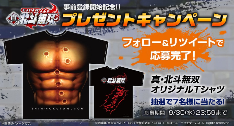 『真・北斗無双』配信決定&事前登録開始を記念して、公式Twitter(https://twitter.com/kt_hokuto)にて「北斗無双」オリジナルTシャツが抽選で7名様に当たるキャンペーンを開催いたします。