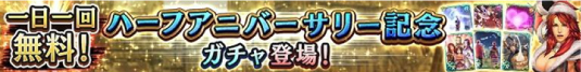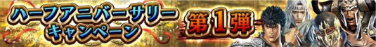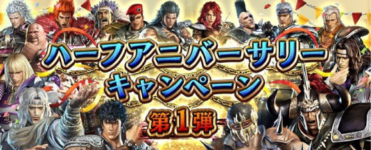 ハーフアニバーサリーを記念してこれまでのイベントで登場した特別な拳士・奥義・世紀末カードが一挙に登場する「ハーフアニバーサリー記念ガチャ」を開始いたしました。