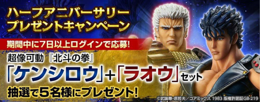 さらに、ハーフアニバーサリーを記念して、『北斗の拳』のグッズが当たるキャンペーンも実施いたします。開催期間のうち 7 日間以上ログインするだけでだれでも対象となりますので、ぜひ奮ってご参加ください。