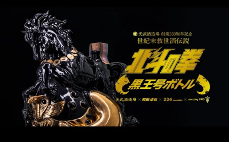 光武酒造場 創業333周年記念!ラオウの象徴として誇り高き愛馬「黒王号」と「拳王兜」をモチーフにした、最高の造形と焼酎による陶器ボトルと焼酎グラス2種のセットの先行予約販売がマクアケにてスタートいたしました。世界中の「北斗の拳」ファンに向けた究極の焼酎を製作するため、世界レベルの技術を結集。原哲夫も驚愕するクオリティで再現された、マスターピースの陶器ボトルと焼酎グラスの豪華セット。「一片の悔い無く」こだわり抜いた究極の一品です。