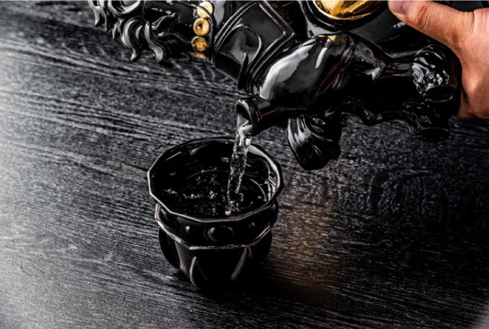 出来上がった原型の設計図が224porcelainの陶芸家 辻氏に渡り、『黒王号ボトル』と『焼酎グラス』の製造を依頼しました。陶磁器での製造には高い技術と経験が必要で、ミリ単位でのこだわりを再現できるよう尽力していただいた結果、度重なる試作を経て、ようやく完成へと至りました。最後に、出来上がったボトルへと、『黒王号』をイメージした芋焼酎を詰め、完成品に仕上がったボトルを手にした時、その気高い美しさに、必ずお喜び頂けることを確信しました。また、デザインのみを追及するだけでなく、持ったとき、使う時の事も考えた焼酎グラスは、手にした瞬間から素晴らしい時間を演出してくれることでしょう。