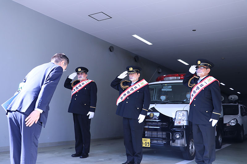 出動式(写真右が原)。3台に分乗し、任務が始まりました。