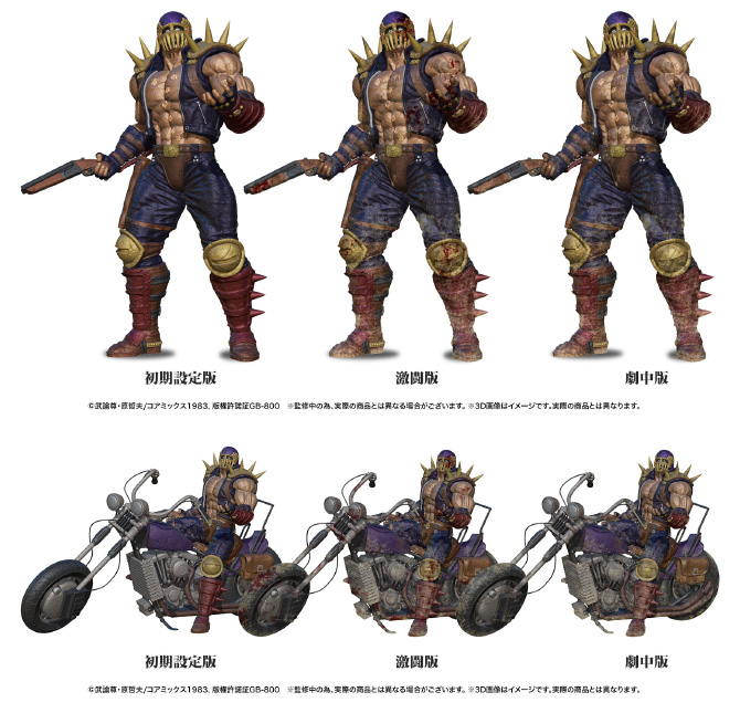 暴力が支配した世紀末を造形や彩色で表現する」をテーマに荒野の乾いた大地の土ぼこり、機械やバイクの油汚れを彩色で魅せる。また「水」が貴重な時代だからこそ衣服は汚れ、命を繋ぐために生死をかけて闘った血痕の跡などが・・・。そんな北斗の拳の世界観を造形・彩色表現で「初期設定版」「劇中版」「激闘版」の3パターンをご用意しました。